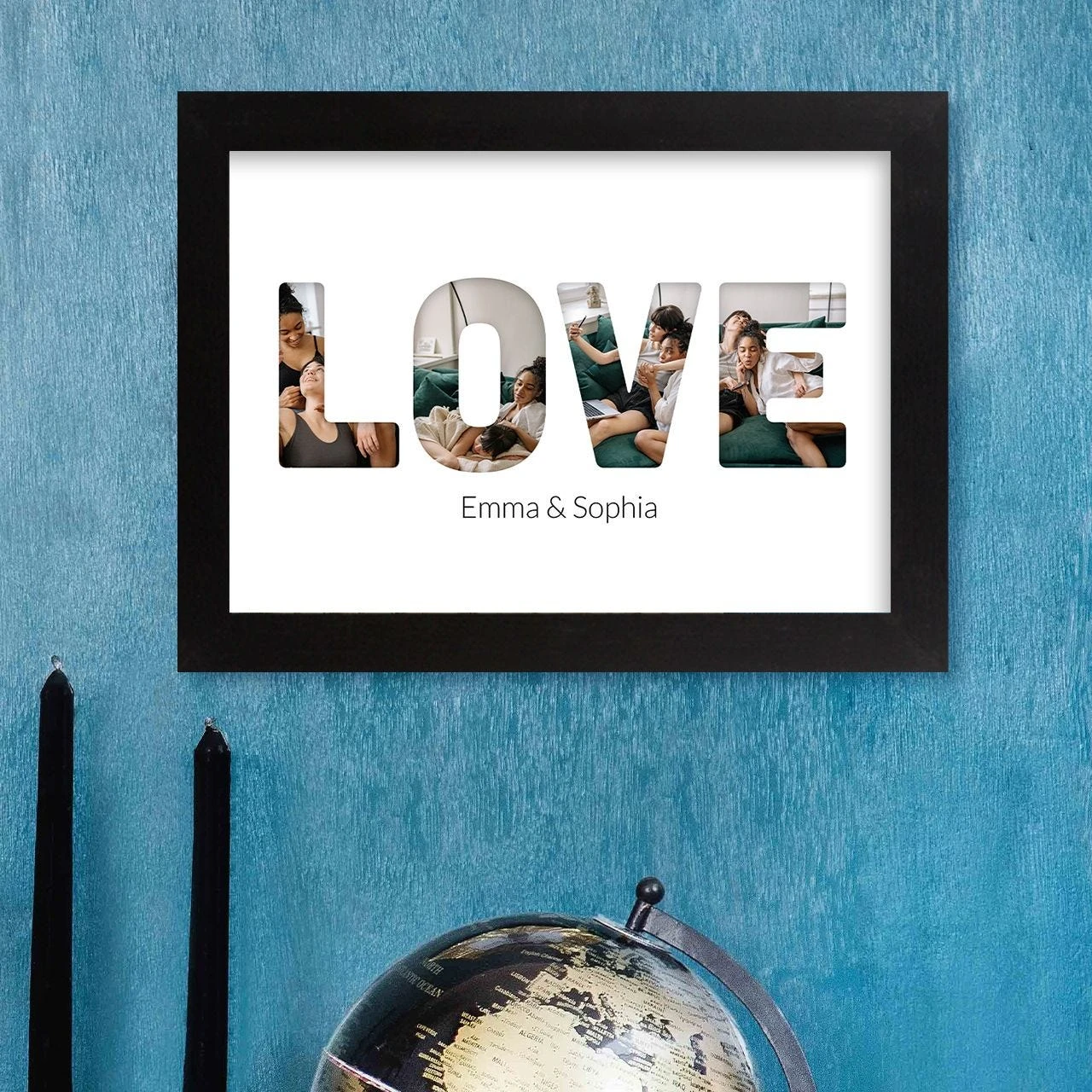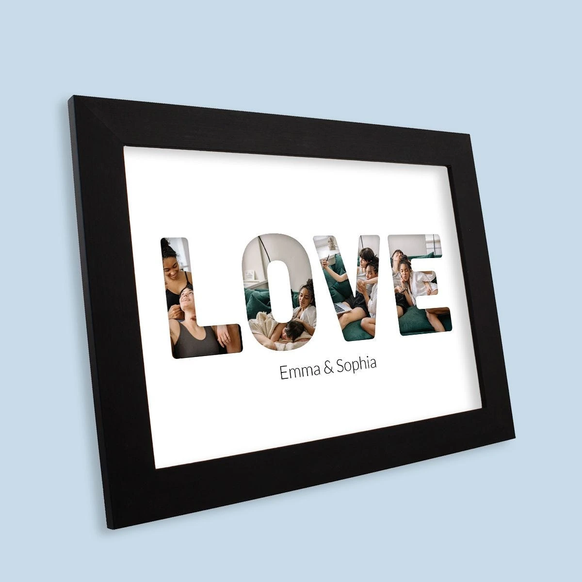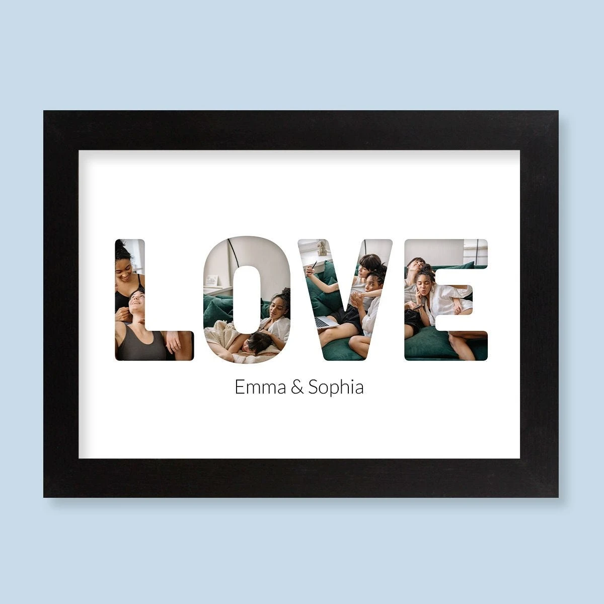 This framed “LOVE” photo collage is the perfect gift for birthdays, anniversaries, Valentine’s Day, or any other day you want to show some love. From your nervy first date to more recent snaps together, your romantic moments will be printed in stunning quality within the “LOVE” lettering – so they’ll always remember just how much they mean to you!
