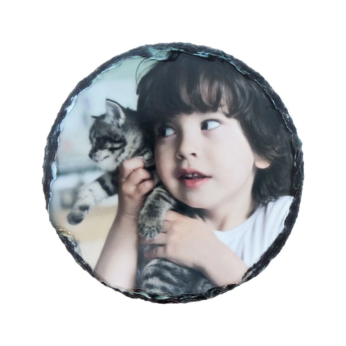 Forget the hanging and framing, you’ve never displayed photos quite like this before. Print your favourite smiles onto personalised photo slate coasters and pop them straight on the table, desk, counter or any other tabletops around your home. These small round photo slates are the perfect size and shape for a coaster!