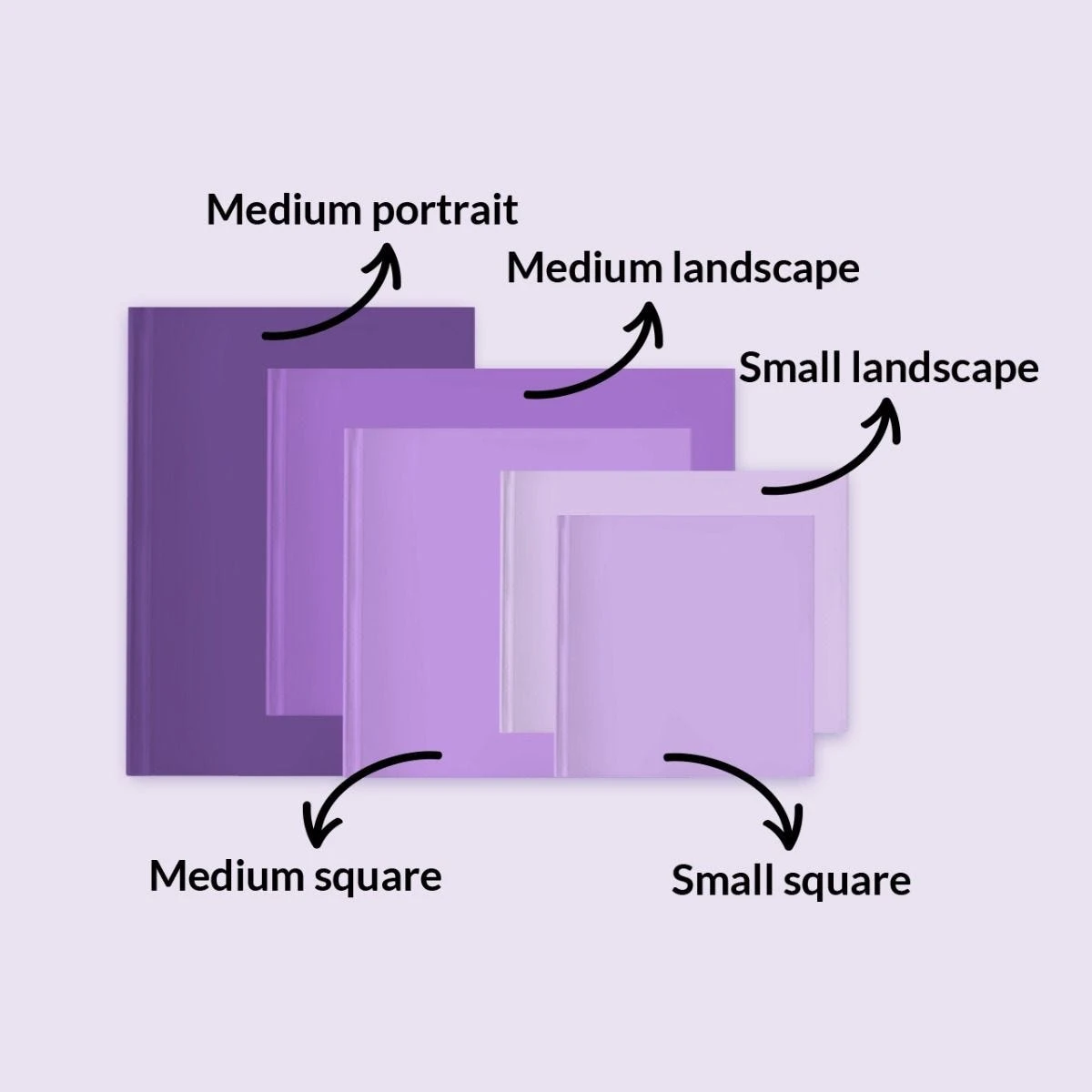 Small square 15×15 cm (6×6″) – Small landscape 20×15 cm (8×6″) – approx A5 – Medium square 20×20 cm (8×8″) – Medium landscape 27×20 cm (11×8″) – approx A4 – Medium portrait 20×27 cm (8×11″) – approx A4