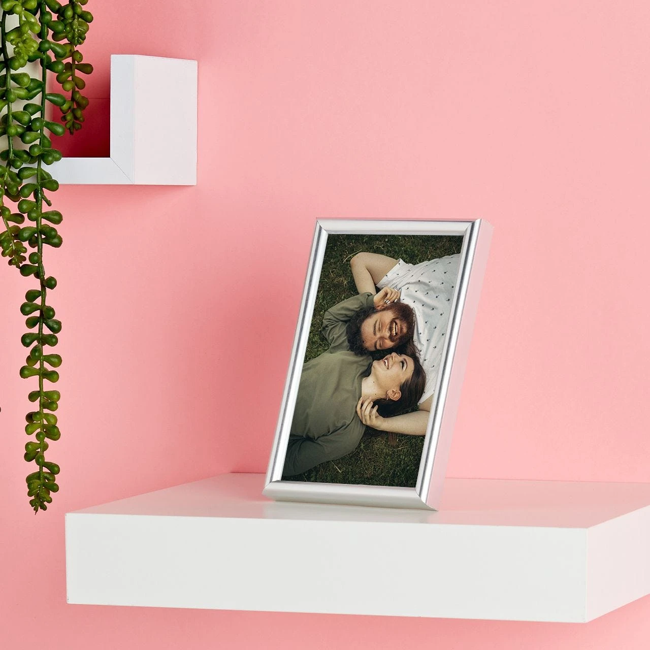 Frame your fave photos and display them all around your home. This beautiful framed photo print is easy to stand on a desk or hang on a wall, displaying your high-quality glossy photo print inside a stylish silver Stacy frame. Showcasing your treasured memories is now easy-peasy!
